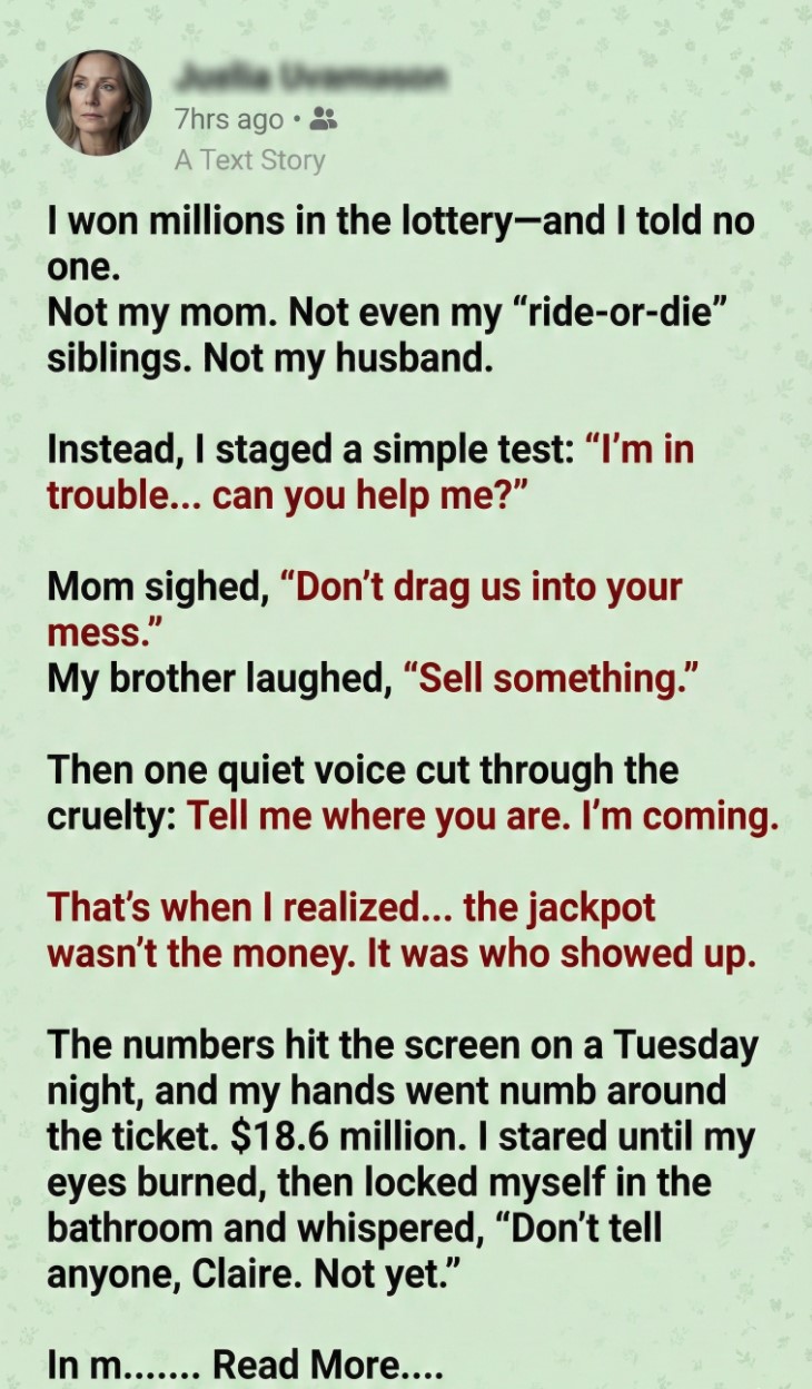 I won millions in the lottery—and I told no one. Not my mom. Not even my “ride-or-die” siblings. Not my husband. Instead, I staged a simple test: “I’m in trouble… can you help me?” Mom sighed, “Don’t drag us into your mess.” My brother laughed, “Sell something.” Then one quiet voice cut through the cruelty: “Tell me where you are. I’m coming.” That’s when I realized… the jackpot wasn’t the money. It was who showed up.