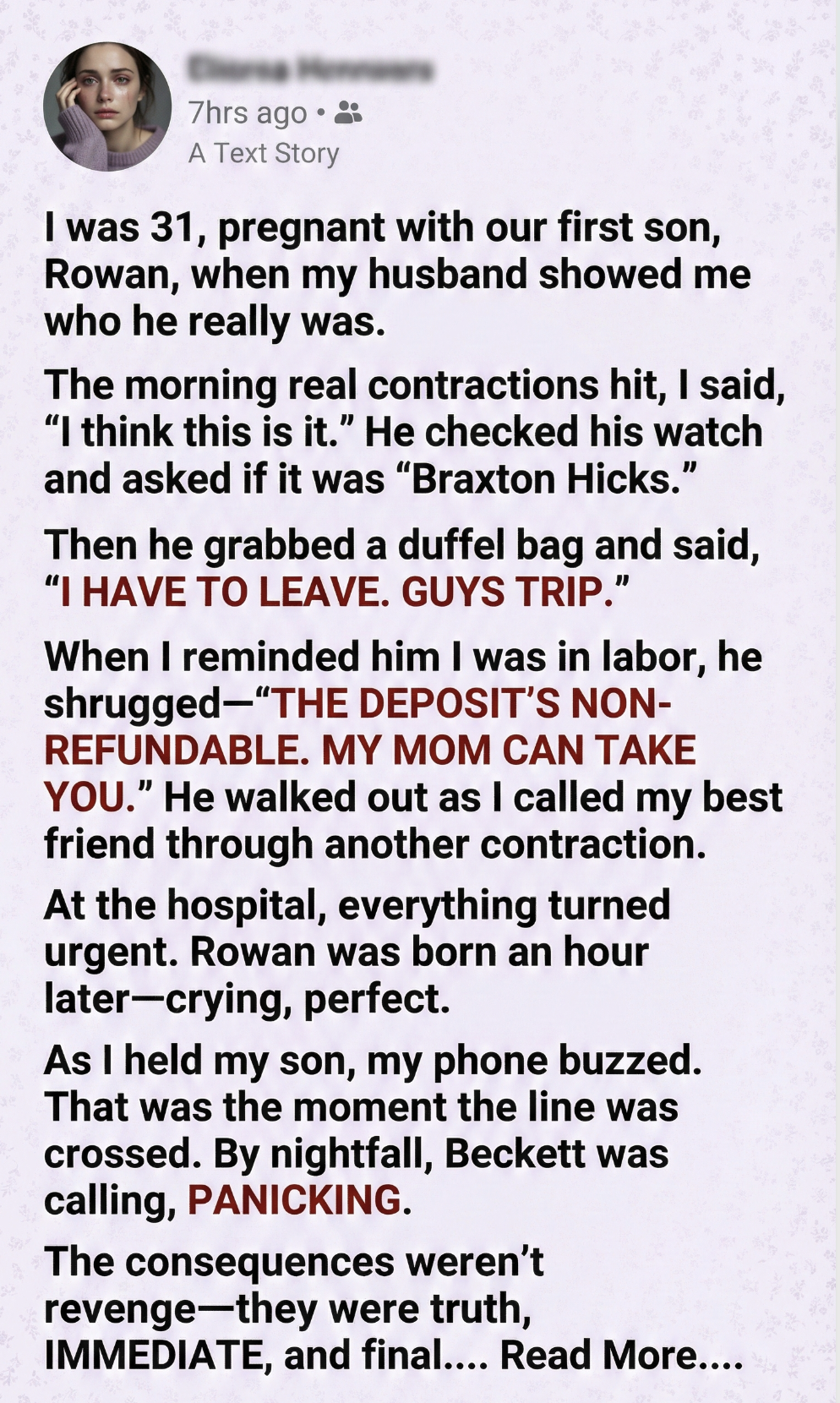 “I’m in labor,” I panted. “Real labor. Beckett just left for a guys’ trip. He said his mom would take me.”