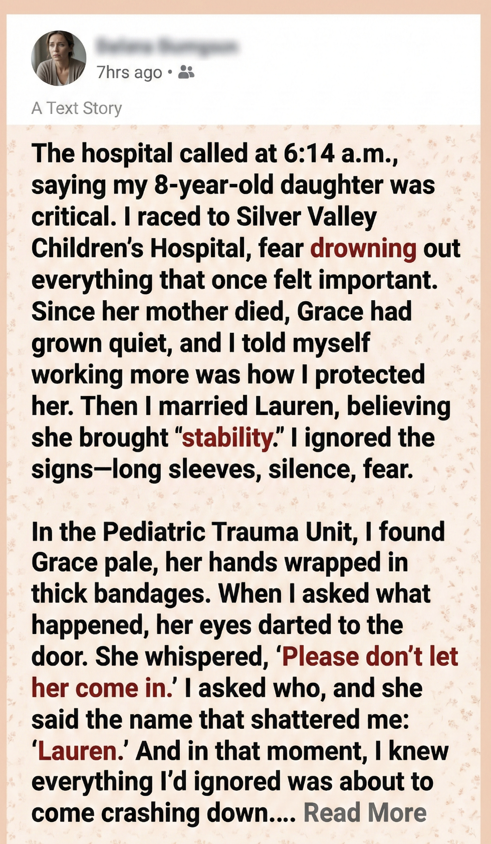 “Daddy,” she whispered, and I dropped to my knees beside her without thinking, the world narrowing to the sound of her breathing and the sight of those bandages.