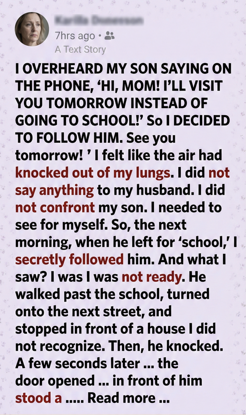 I OVERHEARD MY SON SAYING ON THE PHONE, ‘HI, MOM! I’LL VISIT YOU TOMORROW INSTEAD OF GOING TO SCHOOL!’ So I DECIDED TO FOLLOW HIM. See you tomorrow! ’ I felt like the air had been knocked out of my lungs. I did not say anything to my husband. I did not confront my son. I needed to see for myself. So, the next morning, when he left for ‘school,’ I secretly followed him. And what I saw? I was not ready. He walked past the school, turned onto the next street, and stopped in front of a house I did not recognize. Then, he knocked. A few seconds later … the door opened … in front of him stood a …..