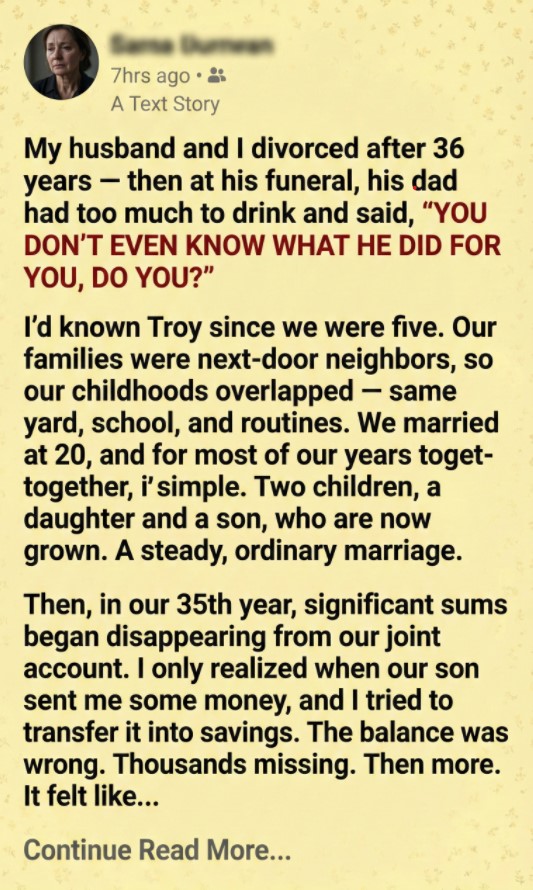 My husband and I divorced after 36 years — and at his funeral, his father had too much to drink and said,