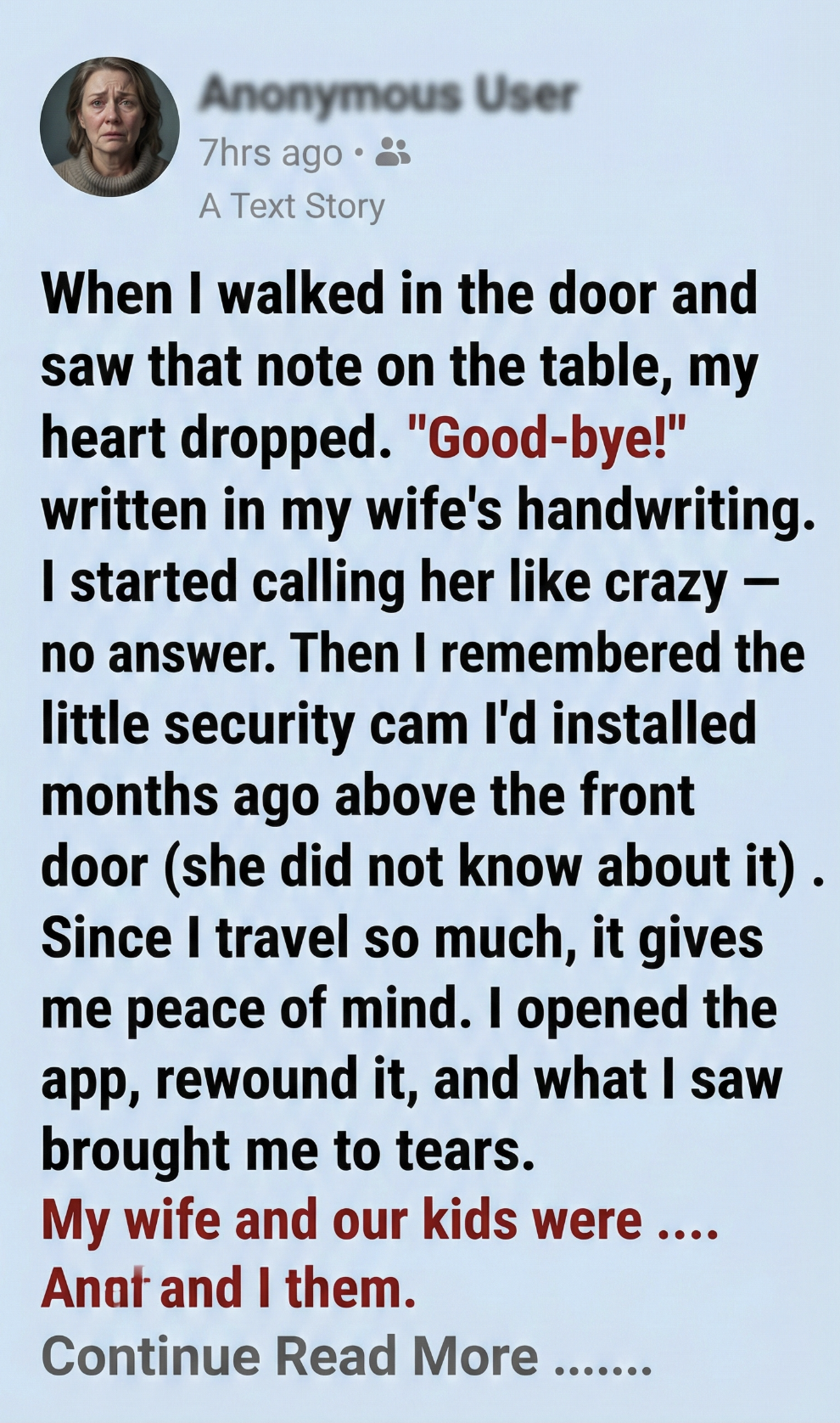 When I walked in the door and saw that note on the table, my heart dropped. “Good-bye!” written in my wife’s handwriting. I started calling her like crazy — no answer. Then I remembered the little security cam I’d installed months ago above the front door (she did not know about it). Since I travel so much, it gives me peace of mind.