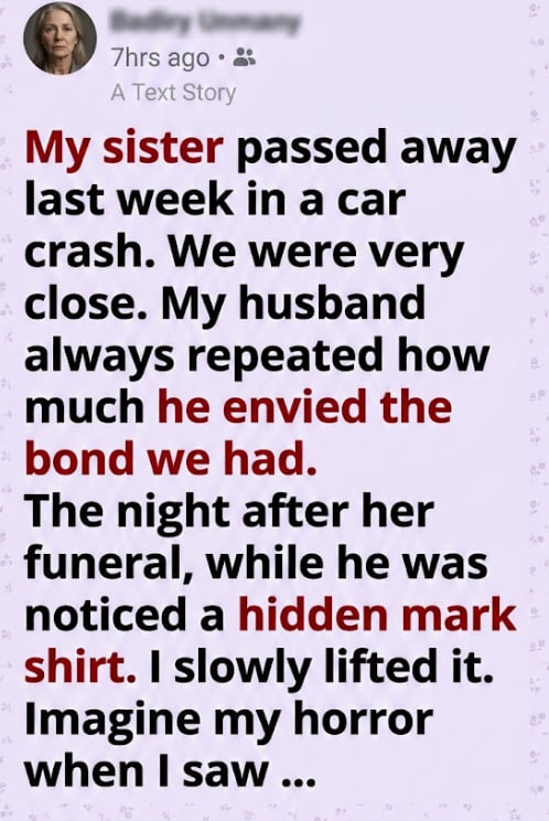My sister passed away last week in a car crash. We were very close. My husband always repeated how much he envied the bond we had.