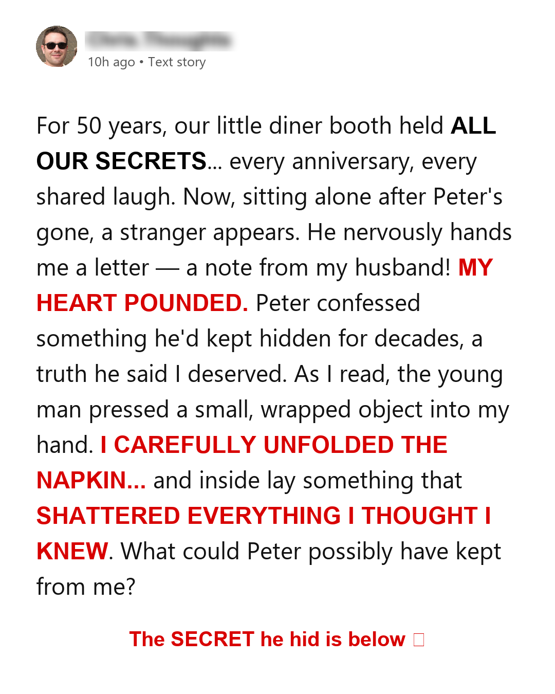 For fifty years, my husband Peter and I shared a tradition: romantic dinners at Marigold’s Diner. It was **our place**. After Peter’s passing, the thought of returning was bittersweet, but I knew I had to honor our memories. Every year on our anniversary, I’d button my coat, fix my lipstick, and make my way to that familiar booth by the window. Stepping into the diner felt like stepping back in time. That booth held a lifetime of memories. But this time, something was different. Someone was already sitting in our spot. A young man, appearing to be in his mid-twenties, nervously checked his watch, clutching a small envelope. The moment he saw me, his eyes widened, and he stood up quickly.