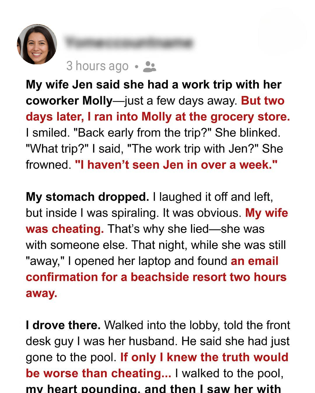 My wife, Jen, had been acting strangely for weeks. Always on her phone, secretive about her whereabouts, and emotionally distant. She told me she had a work trip scheduled with her coworker, Molly. It was supposed to be just a short trip, a few days at most. I didn’t think much of it at the time, trusting her implicitly. I’d always believed in giving her space and not being the overbearing, suspicious husband. I should have seen the red flags sooner. Two days later, I ran into Molly at the grocery store. Thinking she was also back early, I smiled and asked, “Back early from the trip?” Her reaction was not what I expected. She blinked, confusion etched on her face. “What trip?” she asked. I felt a knot forming in my stomach. “The work trip with Jen?” I clarified. She frowned. “I haven’t seen Jen in over a week.” That’s when my stomach dropped to my feet. This was no longer a hunch, it was confirmed. My wife was lying to me and I didn’t know how to handle it.