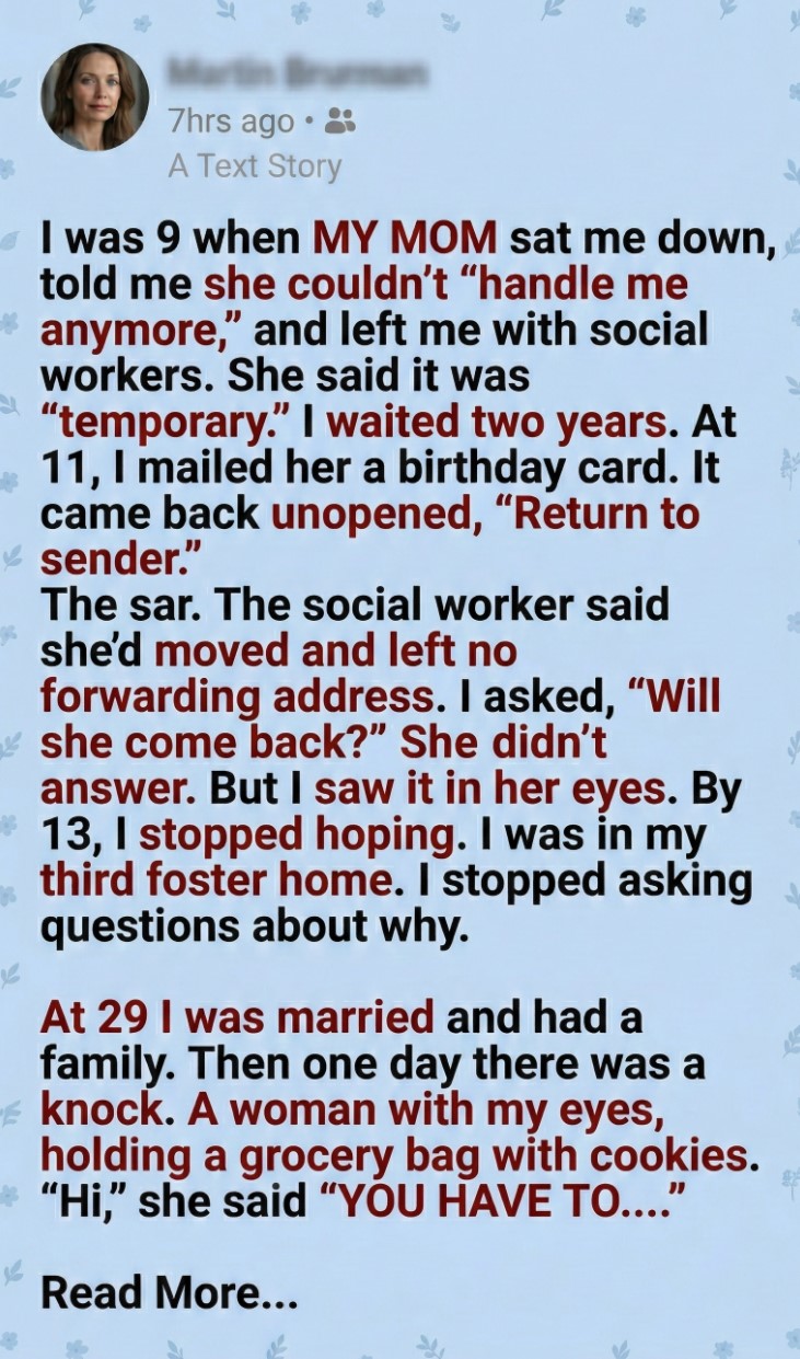 One evening, after putting Emma to bed, I heard it—knock, knock, knock. On the porch stood a frail woman with gray hair, clutching a grocery bag of cookies. Her eyes stopped me cold. They were my eyes.
