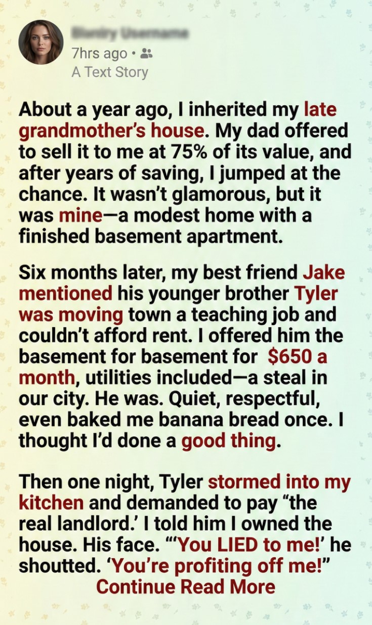 “Profiting off you?” I repeated slowly. “Tyler, you’re paying $650 a month. Utilities included. That barely covers the property tax and bills.”