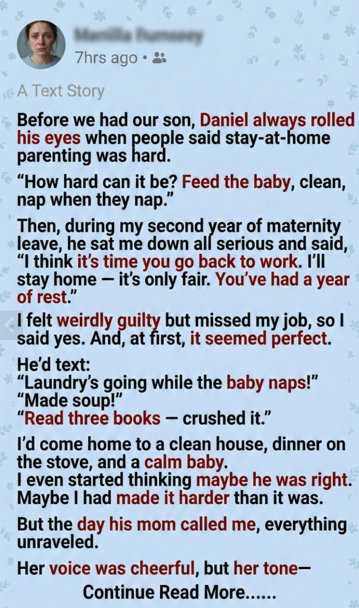 Inside, she was rocking the baby while Daniel stood in the kitchen scrolling on his phone. The soup simmering on the stove suddenly made sense. The folded laundry. The spotless floors.