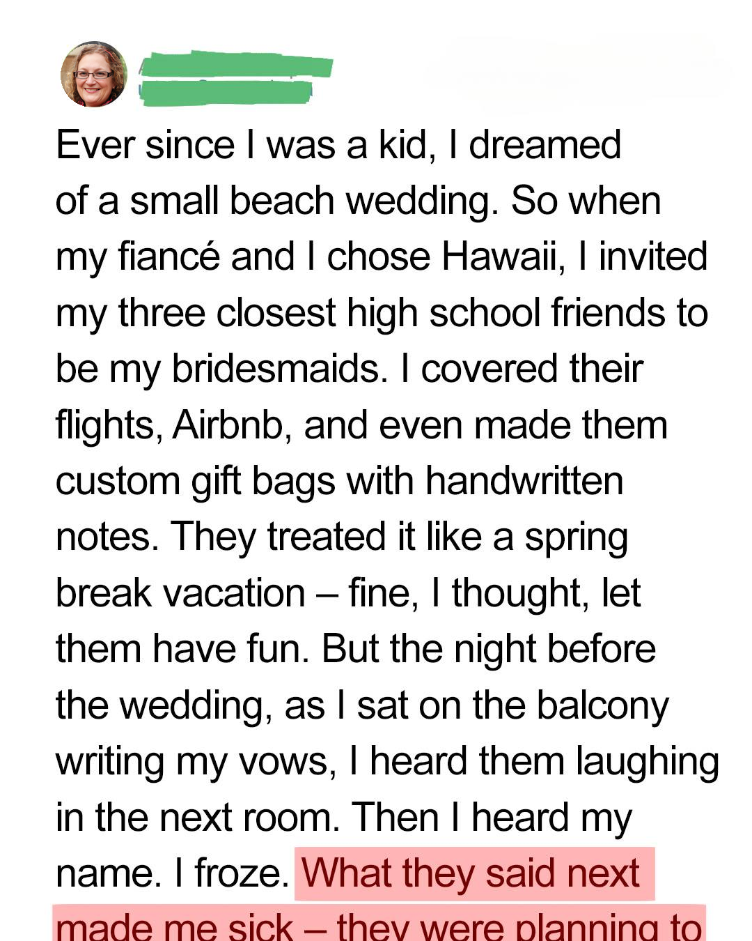 Ever since I was a kid, I dreamed of a small, intimate beach wedding. The idea of exchanging vows with the sand between my toes and the sound of the waves as my soundtrack felt like the epitome of romance. So, when my fiancé, Mark, and I decided to tie the knot in Hawaii, I was ecstatic. I envisioned a simple yet elegant ceremony surrounded by our closest family and friends. To make my dream even more special, I invited my three closest high school friends – Sarah, Emily, and Jessica – to be my bridesmaids. We had been inseparable since freshman year, and I couldn’t imagine getting married without them by my side. To show my appreciation for their friendship and support, I covered their flights to Hawaii, booked a beautiful Airbnb for them to stay in, and even made them custom gift bags filled with thoughtful items and handwritten notes expressing how much their presence meant to me. I really poured my heart and soul into making this trip special for them because they were important to me.