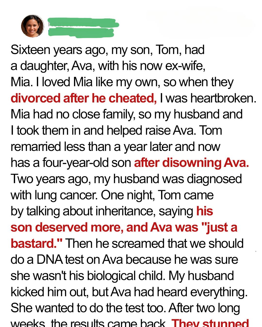 The DNA test had not only revealed that Tom wasn’t Ava’s father, but it had also exposed a secret that had been buried for sixteen years: My husband, David, was her biological father. Apparently, Mia and David had a brief affair before she got with Tom. This explains why we loved Mia so much, it was David’s guilt that made us bring them in! My entire world has been shattered. My son isn’t her dad, and my dying husband IS! [“I don’t even know what to do right now.”]