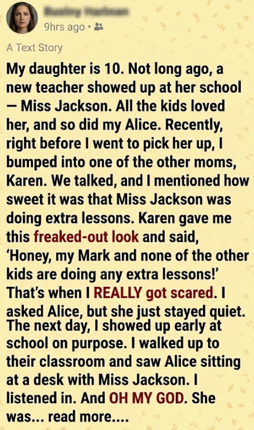 So when Miss Jackson started at Clearview Elementary, I was relieved. She had this way about her—young, maybe early thirties, stylish in that earthy kind of way, and always smiling like she knew something wonderful that hadn’t happened yet. Alice started talking about school more, and even wanted to get there early. She’d chatter away about “Miss J” and how she made class “less boring.”