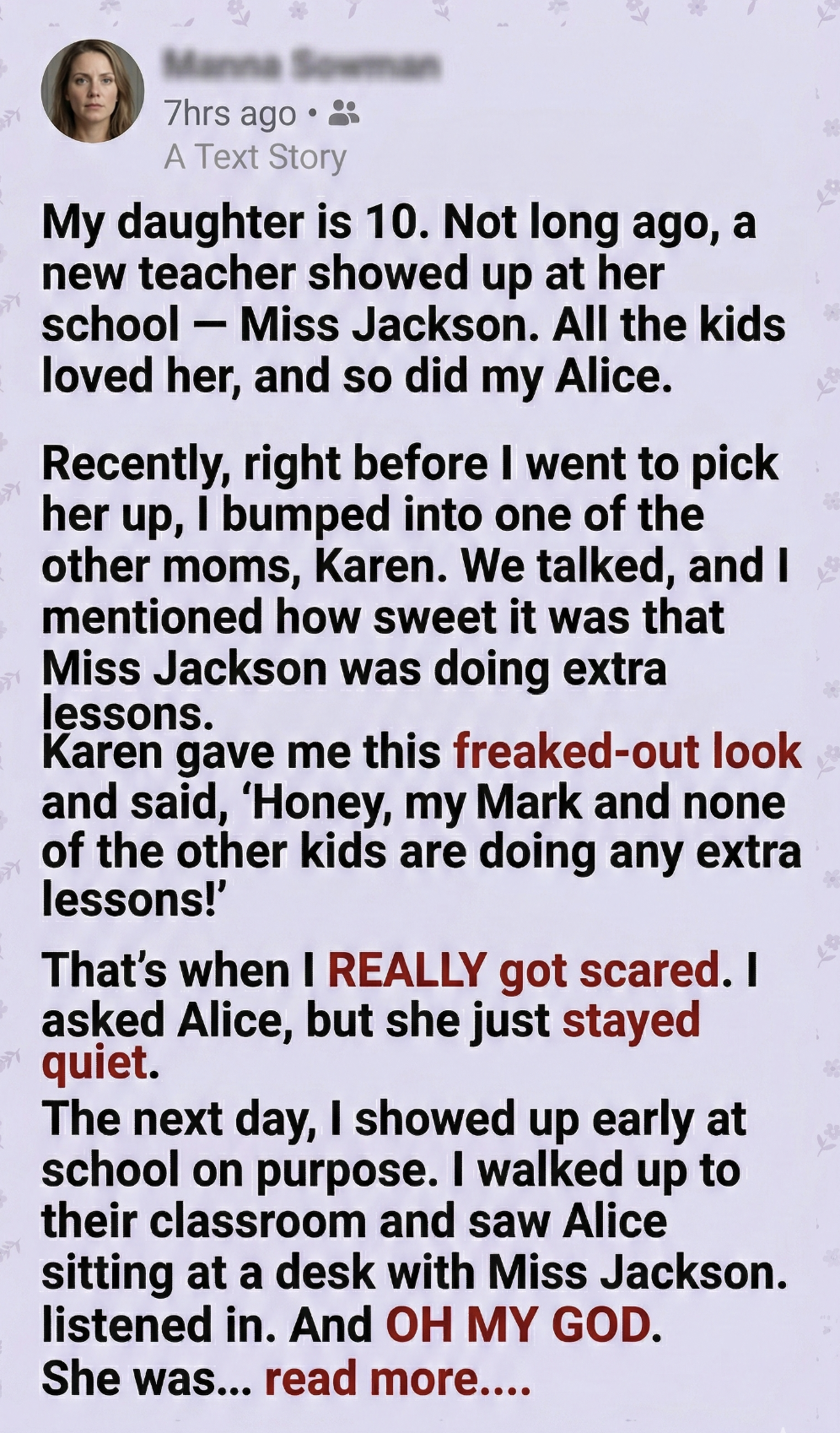 So when Miss Jackson started at Clearview Elementary, I was relieved. She had this way about her—young, maybe early thirties, stylish in that earthy kind of way, and always smiling like she knew something wonderful that hadn’t happened yet. Alice started talking about school more, and even wanted to get there early. She’d chatter away about “Miss J” and how she made class “less boring.”