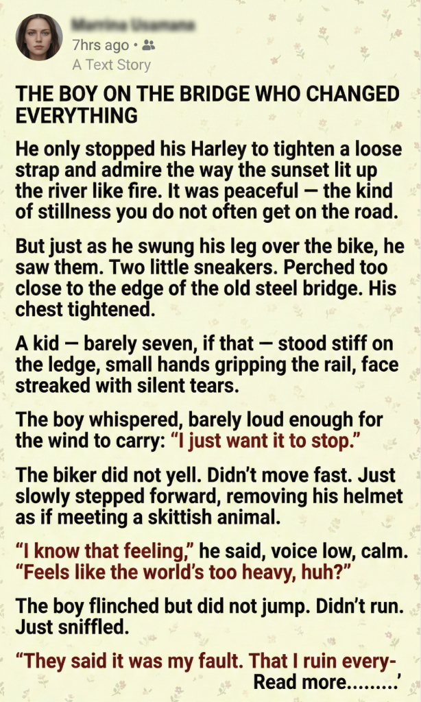 He stopped running that day. Jack ended up becoming a fierce advocate for the kid, working with social services to get him into a safe environment with an aunt who actually cared. He became the boy’s mentor, showing up to every baseball game, every graduation, every bad day, with that loud, rumbling Harley. The boy on the bridge grew up to be a counselor who saved hundreds of others, all because one stranger stopped to tighten a strap, saw the pain, and decided not to look away.