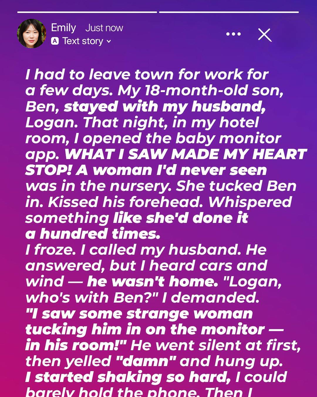 My job sometimes requires me to travel for short periods, and while I usually hate being away from my family, I trust my husband, Logan, implicitly. We have an 18-month-old son, Ben, who is the light of our lives. So, when I had to leave for a few days, I wasn’t overly concerned, knowing that Logan is a capable and loving father. I arrived at my hotel late that evening, exhausted from the travel. After unpacking and settling in, I decided to check in on Ben. We have a baby monitor app on our phones that allows us to see and hear what’s happening in his nursery. I opened the app, expecting to see my sweet boy sleeping peacefully in his crib. But what I saw made my heart stop. Absolutely everything in my world did a 180 degree turn. Instead of Logan, or even an empty room, there was a woman I had never seen before. She was gently tucking Ben into his crib, her movements practiced and tender. She kissed his forehead and whispered something softly, like she had done it a hundred times before. A wave of nausea washed over me, and I felt like I was going to faint. Who was this woman, and what was she doing with my child?