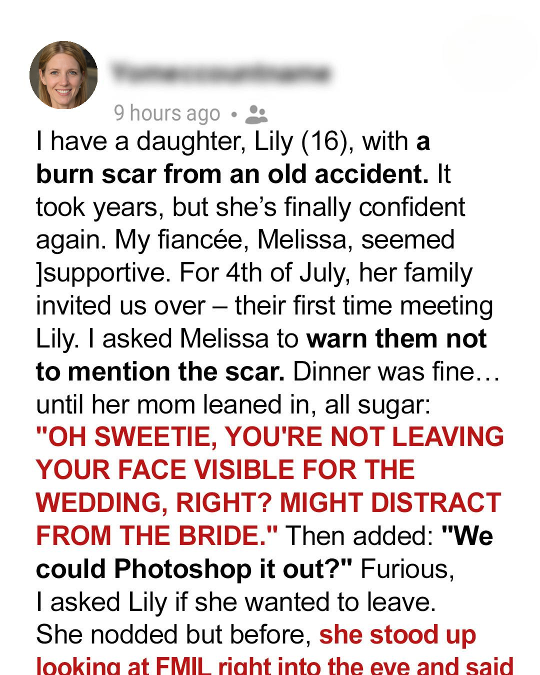 My daughter, Lily, is 16 years old and an absolute ray of sunshine. Unfortunately, when she was younger, she was involved in an accident that left her with a burn scar on her face. It was a long and difficult journey, filled with countless doctor’s appointments and emotional hurdles, but she has finally reached a point where she feels confident and comfortable in her own skin. I am incredibly proud of the strength and resilience she has shown throughout it all. I recently got engaged to my fiancée, Melissa, who I love very much. She has always seemed incredibly supportive of Lily and understanding of the challenges she has faced. I truly believed that Melissa would be a wonderful addition to our family and that she would treat Lily with the love and respect she deserves. However, recent events have made me question everything I thought I knew. For the 4th of July, Melissa’s family invited us over for a barbecue. It was supposed to be a casual and fun get-together, and I was excited for Lily to finally meet them. This would be the first time that she would be meeting Melissa’s entire extended family and I asked Melissa beforehand to please warn her family not to mention the scar. I wanted to avoid any awkward or hurtful situations for Lily, as I knew that unsolicited comments or questions could be incredibly triggering for her. Melissa assured me that she would take care of it, and I trusted that she would.