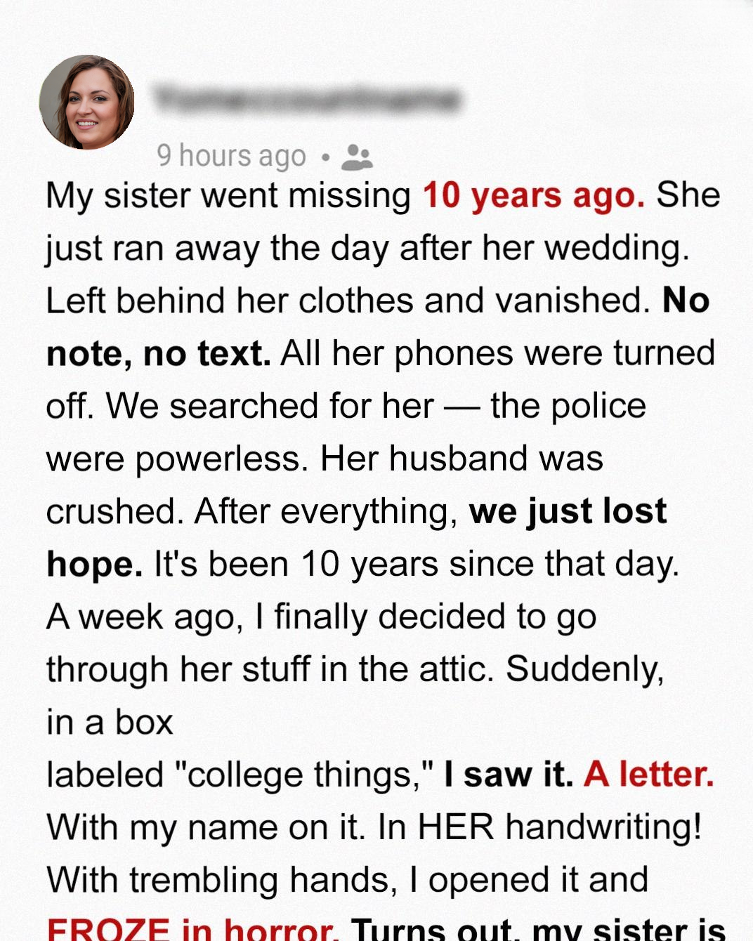 The revelation was earth-shattering, a seismic shift in my understanding of my sister and her disappearance. The woman I thought I knew was a phantom and I now felt the [“BITTER TASTE OF BETRAYAL”]. It was like finding out that the person I had loved and trusted most in the world had been living a lie, and that our entire relationship had been built on a foundation of secrets and deceit. It’s now been a week since I found that letter, and I still don’t know what to do. I was told not to say anything to anyone, but how can I keep this secret to myself?
