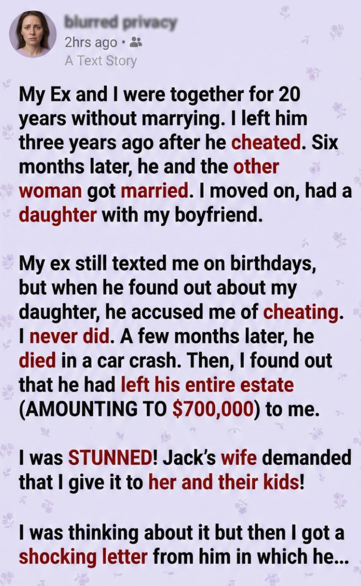 A woman’s life took a shocking turn when her ex-boyfriend—who cheated, remarried, and later died—left her his entire $700,000 estate. His pregnant wife got nothing, sparking a bitter feud that has gone viral.