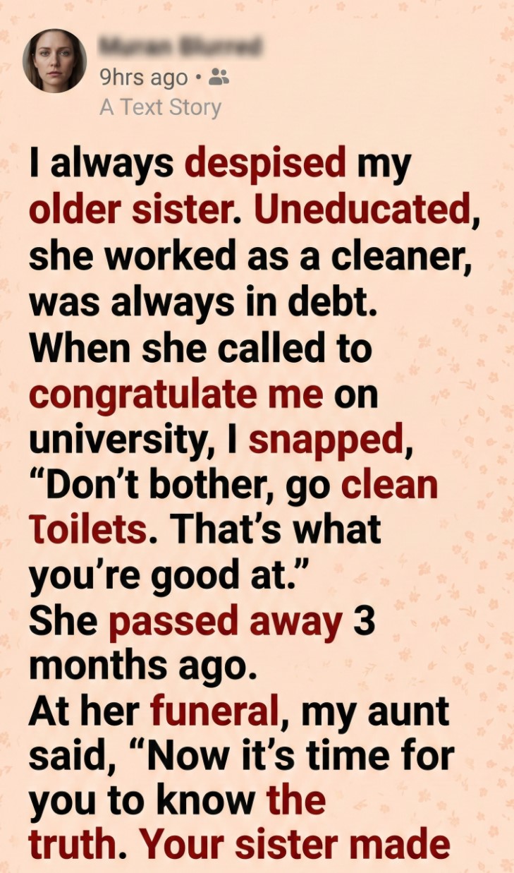 “She never got a proper education or a good job because she wanted you to have it all,” my aunt said softly. “It was a family secret. She forbade everyone from telling you. She said if you knew, you’d feel pressured. Or guilty. She wanted you to succeed freely.”