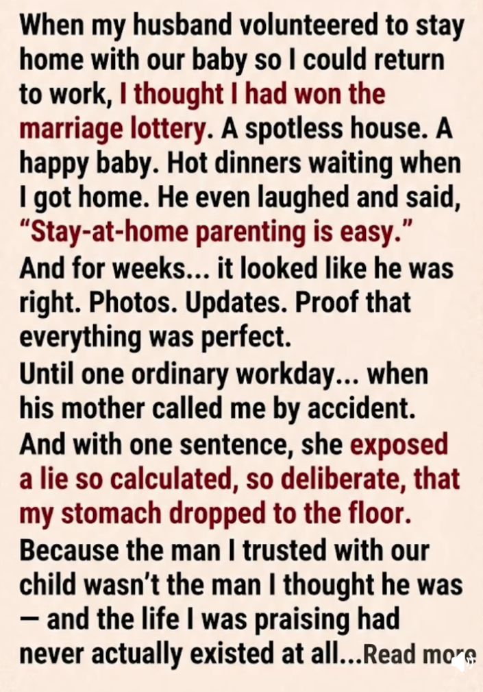 āHey babe!ā he beamed, looking at me with those lying eyes. āWhew, what a day. Leo was a handful, and I scrubbed the bathroom, but I managed to whip up your favorite lasagna.ā