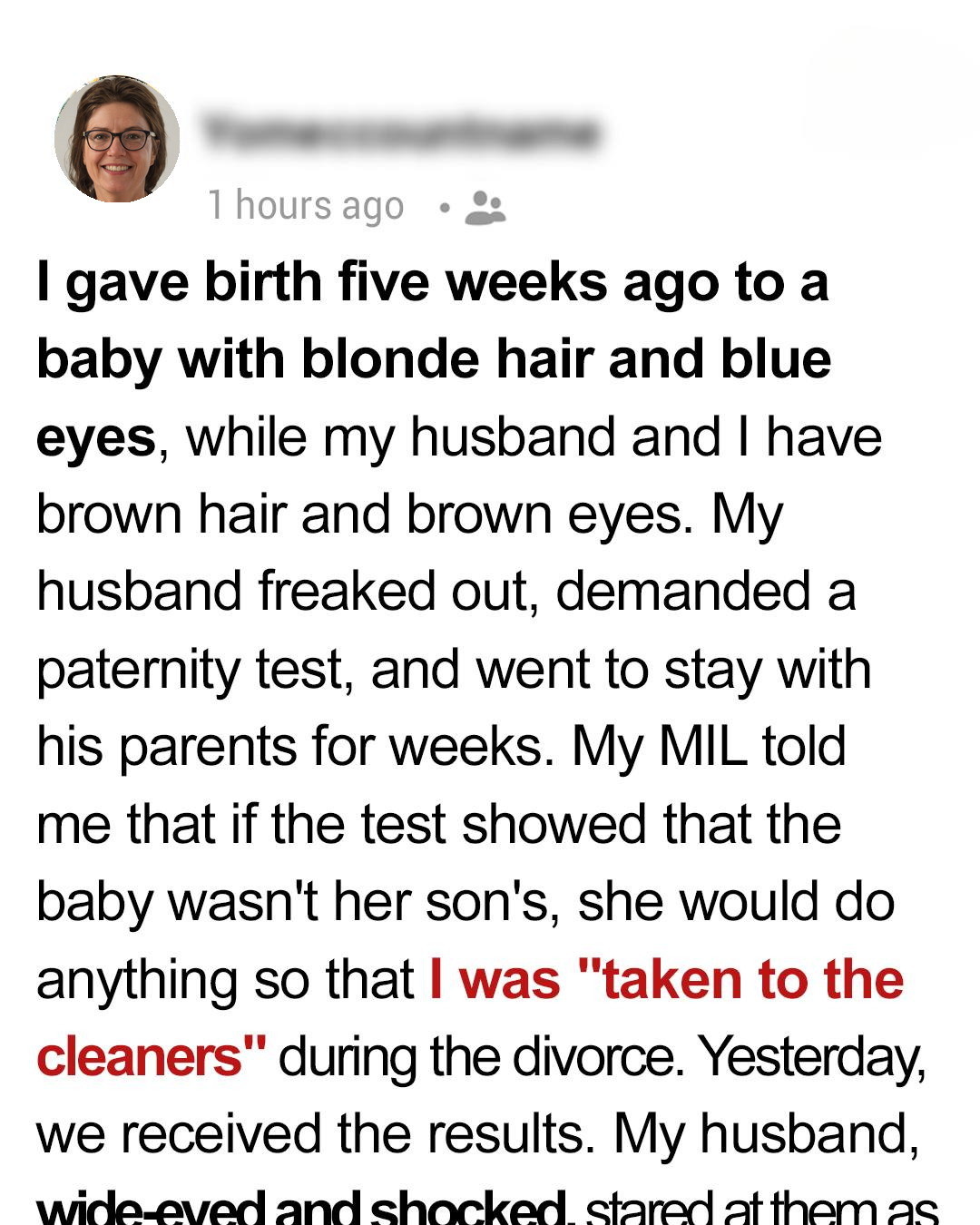 Five weeks ago, a moment of pure joy turned into a nightmare. I gave birth to a beautiful, healthy baby. As I held my newborn for the first time, I felt an overwhelming sense of love and protectiveness. Everything seemed perfect, until my husband took a closer look. He noticed something that immediately made him question everything: the baby had blonde hair and striking blue eyes. My husband and I both have dark brown hair and brown eyes. I noticed the color change in his face immediately. He **became pale** and started to question how this could happen. I assured him that it was probably just genetics, and to not overreact, but he was already spiraling out of control. His reaction was immediate and devastating. He didn’t say a word to me. He instead stared at the baby and then back at me, with a face that I will never forget. He demanded a paternity test, convinced that I had been unfaithful. I was absolutely floored! How could he think that of me? I had never given him any reason not to trust me! He accused me of cheating, and I immediately started bawling. The worst part was that he didn’t believe my cries of innocence.