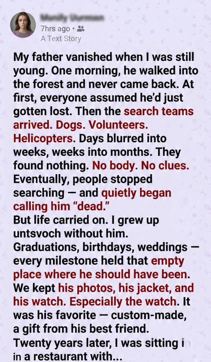 The man looked down at the watch, rubbing the worn leather strap with his thumb. “He didn’t get lost in the forest,” he said quietly. “He left.”