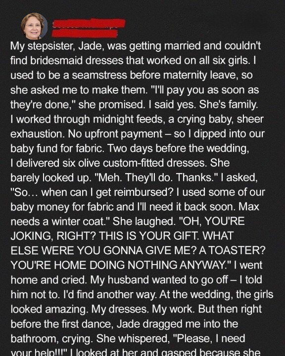 My stepsister, Jade, was getting married and facing a bridesmaid dress crisis. She had six bridesmaids, and finding dresses that fit everyone and looked good on all of them seemed impossible. Knowing I used to work as a seamstress before taking maternity leave, she approached me with a proposition: would I be willing to make the dresses? “I’ll pay you as soon as they’re done,” she promised, emphasizing that she understood the time and effort involved. I hesitated at first, juggling a new baby and constant exhaustion, but she was family. I agreed. The task was immense. Working through midnight feeds, a constantly crying baby, and sheer exhaustion, I somehow managed to create six custom-fitted olive-green dresses. Because there was no upfront payment as promised, I dipped into our baby fund to cover the cost of the fabric. It was a significant amount, and I was relying on Jade to reimburse me quickly. Two days before the wedding, I proudly delivered the dresses. Jade barely glanced at them. “Meh. They’ll do. Thanks,” she muttered dismissively.