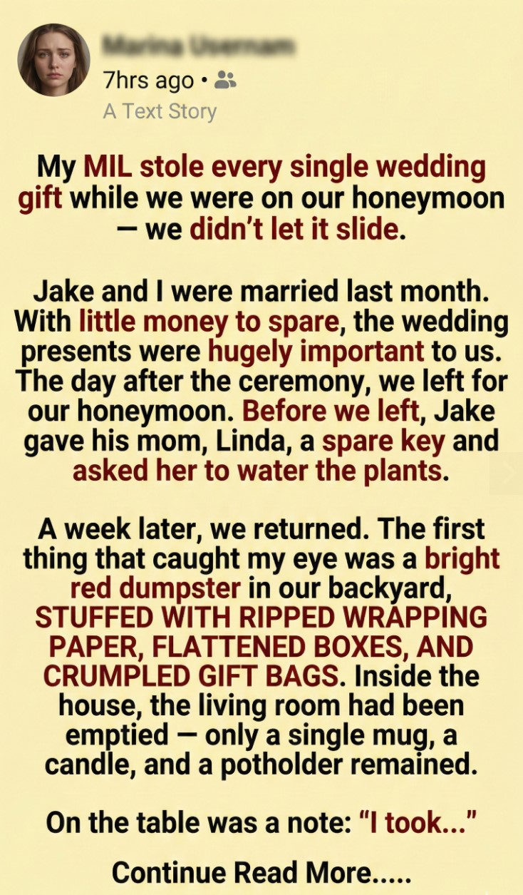 An officer came within the hour. We showed him the dumpster, the empty rooms, the note. We pulled up our wedding registry and photos from the reception showing the gifts stacked high.