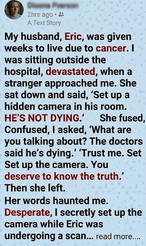 Her words haunted me. Desperate, I secretly set up the camera while Eric was undergoing a scan.
