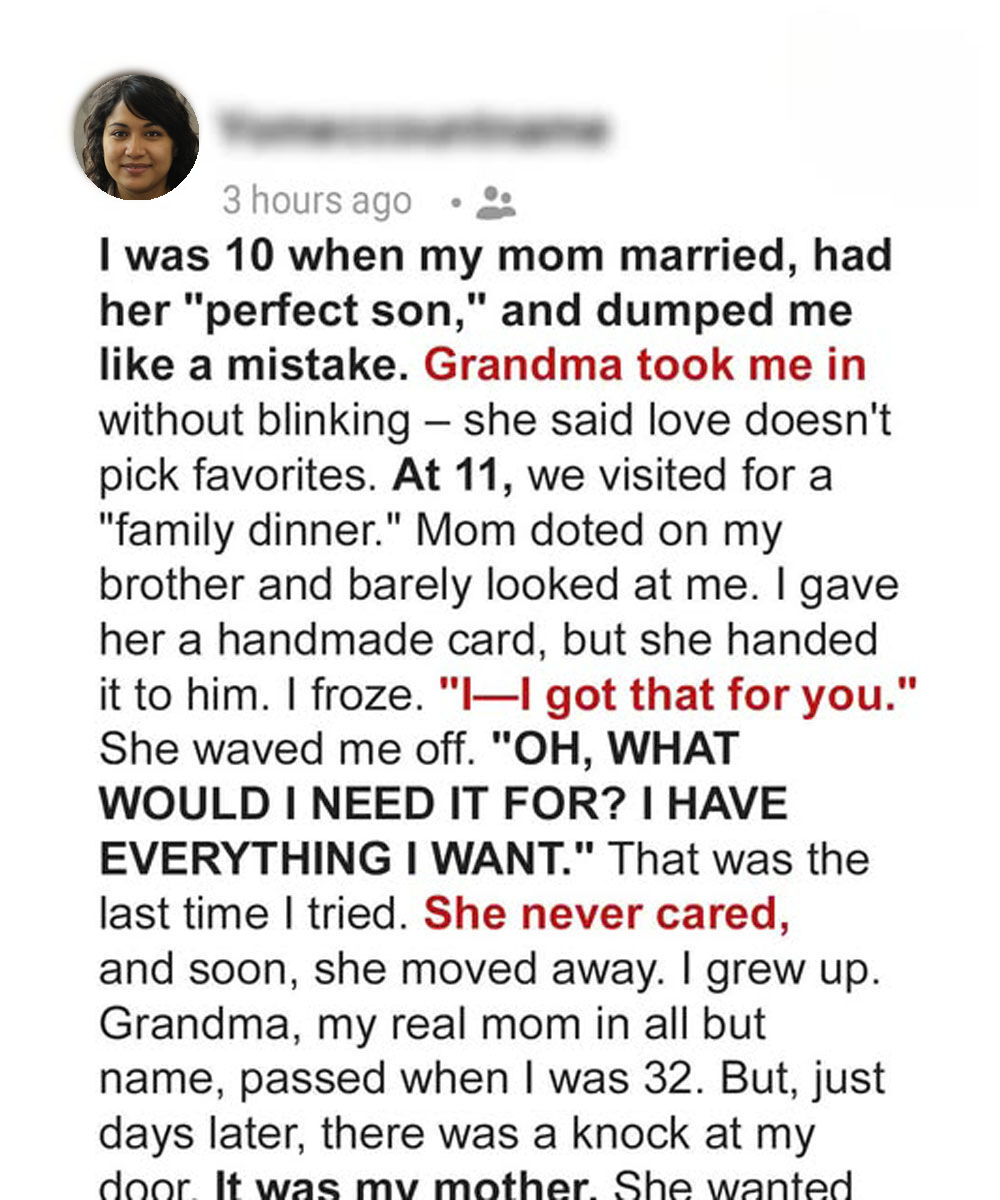 Grandma, my real mom in all but name, passed away when I was 32. The grief was overwhelming, a void that seemed impossible to fill. She was the only constant in my life, the one person who had always been there for me. **Just days after her funeral, there was a knock at my door.** I opened it to find my mother standing there.