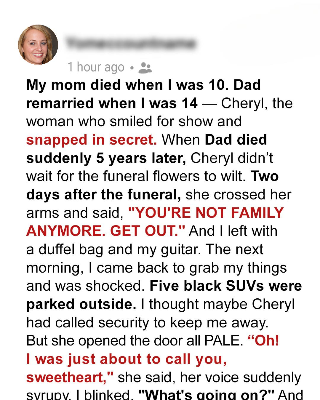 The next morning, I decided to go back to the house to retrieve the rest of my belongings. I needed my music equipment, my books, my clothes – everything that made up my life. As I approached the house, I was met with a bizarre sight. Five black SUVs were parked in the driveway, their windows tinted, their engines idling. My first thought was that Cheryl had called security to keep me away. That she was so afraid of me that she needed to hire bodyguards to protect her. But as I got closer, I saw Cheryl standing on the porch, her face pale and drawn.