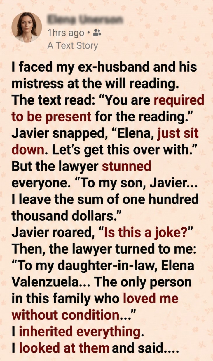 The heavy oak door of the notary’s office felt like a barrier between two worlds, separating the quiet sanity of the hallway from the suffocating toxicity waiting inside, yet I walked through it knowing that my ex-husband, his mistress, and his mother would be waiting like vultures circling a carcass. I showed up anyway, not because I wanted to see the faces that had haunted my nightmares for the past year, nor because I missed the life I had violently lost, but because the message on my phone had made my stomach drop with a command I couldn’t ignore: “You are required to be present for the reading.” When I finally stepped into the room, the air was thick with the scent of expensive leather and old paper, a smell that usually comforted me but today made me nauseous. I didn’t sit down in the empty chair they had left for me; instead, I stayed standing near the bookshelf with my arms crossed tight against my chest, as if keeping my body rigid enough would prevent my heart from betraying the anxiety thundering against my ribs. The lawyer, Gavin Herrera, looked up from his desk, adjusted his wire-rimmed glasses, and spoke with a professional calm that contrasted sharply with the tension in the room, looking directly at me to say, “Mrs. Valenzuela… I’m glad you decided to join us.”