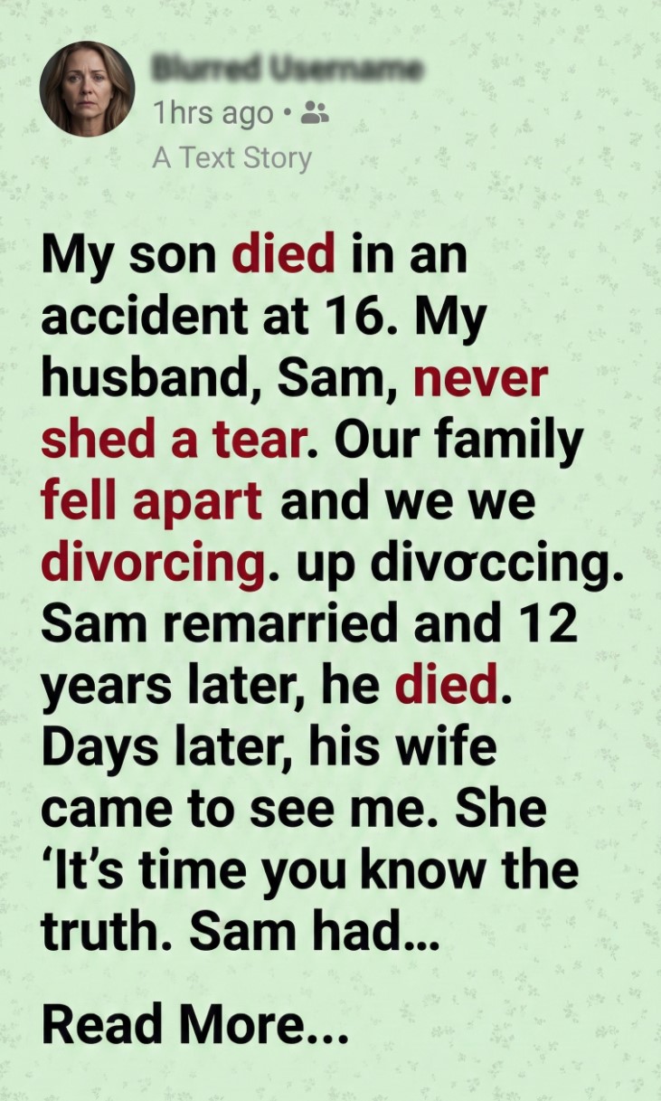 The day our son Leo died, the sun still shone, an insult in its own way. Leo, just sixteen, was gone in an instant, leaving me to drown in grief. I thought my marriage would anchor me, but my husband, Sam, retreated into a silence I couldn’t reach. He didn’t cry, didn’t speak about Leo—he simply withdrew. Eventually, we drifted apart, and Sam remarried, leaving me to nurse years of bitterness and resentment.
