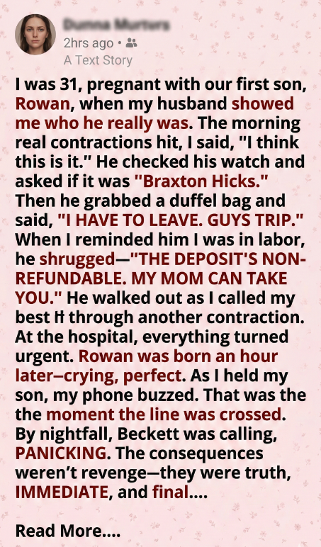 “Text me your contraction times,” she said. Her voice went flat and focused. “I’m leaving work right now. Do not drive. Do not wait for his mother.”