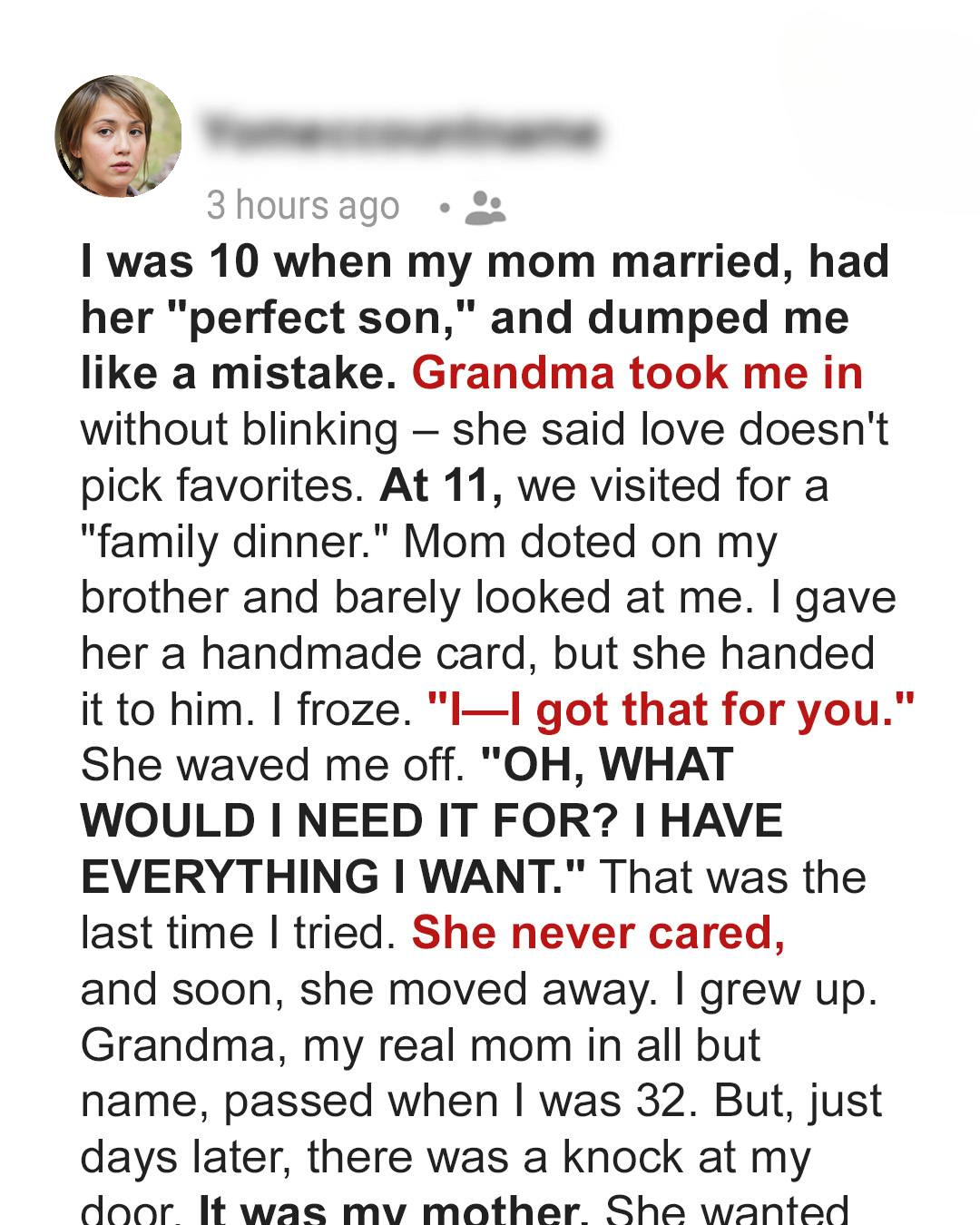 Years passed, and I built a life for myself, always carrying a sliver of hope that my mother would one day reach out. But she never did. Grandma, my anchor, my guiding star, passed away when I was thirty-two. I was heartbroken, lost in a sea of grief. But just days later, there was a knock at my door. It was my mother. I hadn’t seen her in over twenty years. She looked older, worn down, and… desperate.
