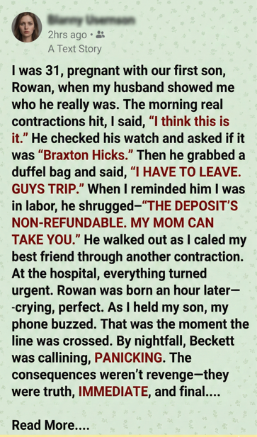 “Text me your contraction times,” she said. Her voice went flat and focused. “I’m leaving work right now. Do not drive. Do not wait for his mother.”