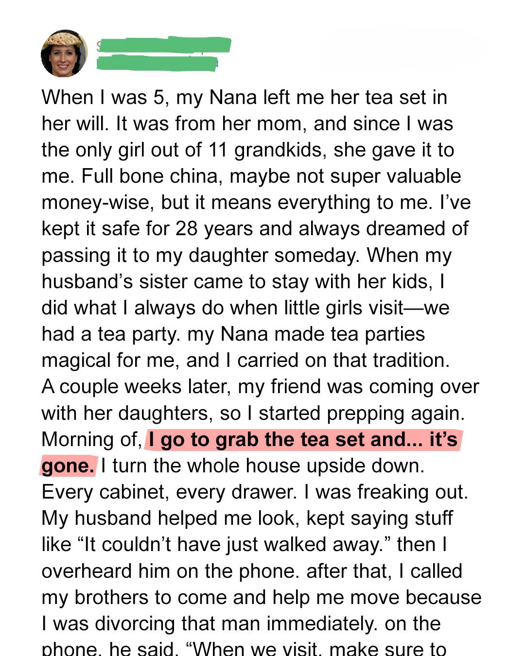 Then, disaster struck. When my friend called announcing her planned visit and the arrival of her two daughters, I eagerly prepared for another tea party. I went to the china cabinet, ready to grab the tea set. But when I opened the doors, I saw an empty space where the set was usually kept. My heart plummeted. Panic surged through my veins as I frantically searched every nook and cranny of our house. Every cabinet, every drawer, every possible hiding place – I turned everything upside down in my desperate attempt to find it.