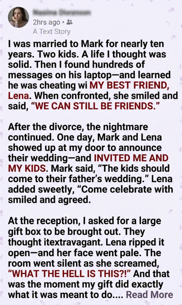 When Sarah is invited to the wedding of her ex-husband and ex-best friend, she chooses grace over chaos, or so it seems. In a story about betrayal, resilience, and the power of quiet truth, one woman brings a gift that no one saw coming… and no one will ever forget.