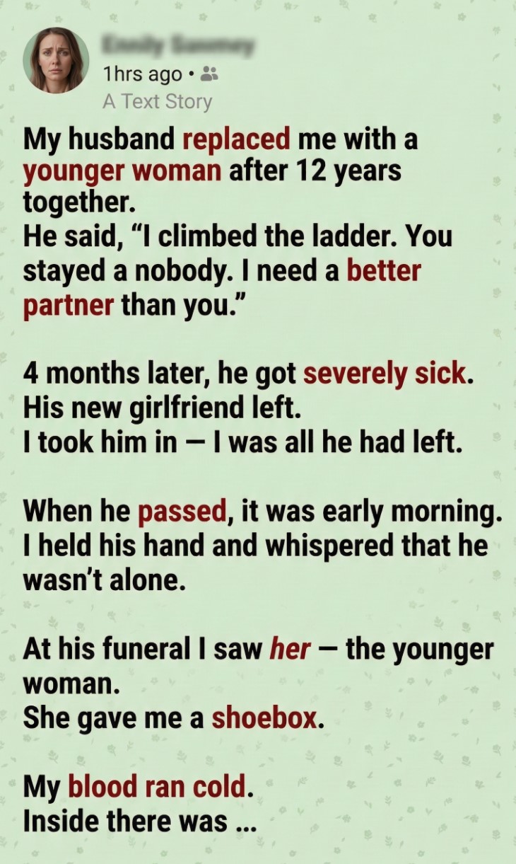 At the funeral, I noticed her—the younger woman—standing awkwardly at the edge of the crowd. Later, she approached, holding a small shoebox.