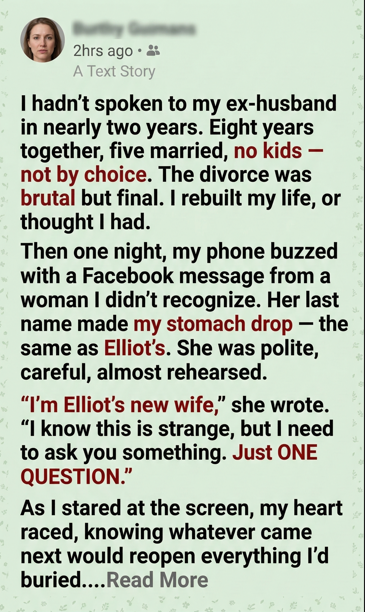 “Hi. I’m sorry to bother you. I’m Elliot’s new wife. I know this is strange, but I need to ask you something. Elliot asked me to reach out. He said it would sound better coming from me. I didn’t want to, but… I’ve been feeling weird about how he’s acting. It’s just one question. Can I?”