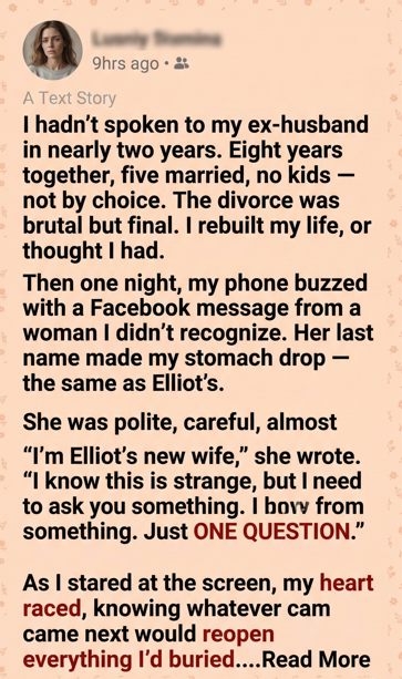 “Hi. I’m sorry to bother you. I’m Elliot’s new wife. I know this is strange, but I need to ask you something. Elliot asked me to reach out. He said it would sound better coming from me. I didn’t want to, but… I’ve been feeling weird about how he’s acting. It’s just one question. Can I?”