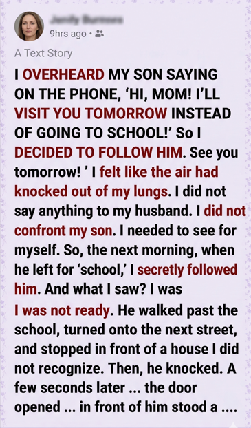 I OVERHEARD MY SON SAYING ON THE PHONE, ‘HI, MOM! I’LL VISIT YOU TOMORROW INSTEAD OF GOING TO SCHOOL!’ So I DECIDED TO FOLLOW HIM. See you tomorrow! ’ I felt like the air had been knocked out of my lungs. I did not say anything to my husband. I did not confront my son. I needed to see for myself. So, the next morning, when he left for ‘school,’ I secretly followed him. And what I saw? I was not ready. He walked past the school, turned onto the next street, and stopped in front of a house I did not recognize. Then, he knocked. A few seconds later … the door opened … in front of him stood a …..