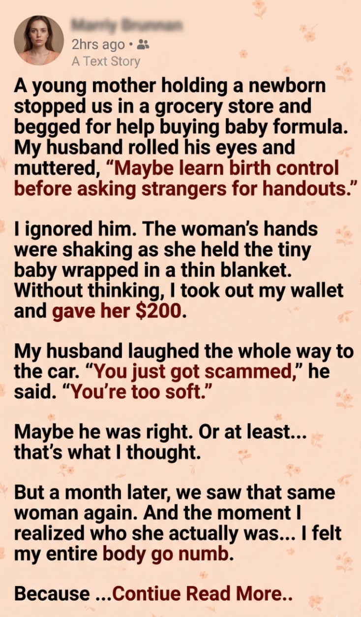 She explained that a month ago had been the worst day of her life. Her husband had suddenly passed away, and she had been left alone with a newborn and no nearby family. Her bank account had been temporarily frozen due to paperwork issues after his death, and she couldn’t access her money.