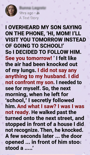 I OVERHEARD MY SON SAYING ON THE PHONE, ‘HI, MOM! I’LL VISIT YOU TOMORROW INSTEAD OF GOING TO SCHOOL!’ So I DECIDED TO FOLLOW HIM. See you tomorrow! ’ I felt like the air had been knocked out of my lungs. I did not say anything to my husband. I did not confront my son. I needed to see for myself. So, the next morning, when he left for ‘school,’ I secretly followed him. And what I saw? I was not ready. He walked past the school, turned onto the next street, and stopped in front of a house I did not recognize. Then, he knocked. A few seconds later … the door opened … in front of him stood a …..