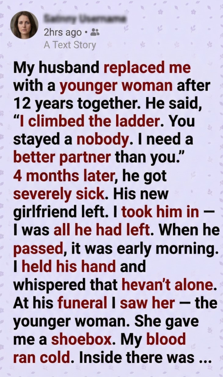 At the funeral, I noticed her—the younger woman—standing awkwardly at the edge of the crowd. Later, she approached, holding a small shoebox.