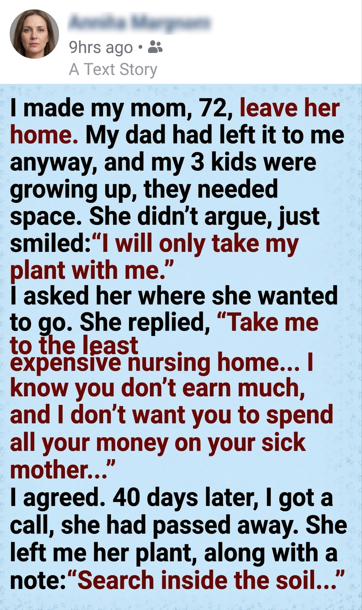 That night, I held the plant against my chest like it was the last piece of her I had left. I whispered apologies into the empty house. I told her I was sorry for not visiting more. Sorry for choosing convenience over compassion. Sorry for not holding her hand when she needed it most.