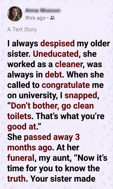 “She never got a proper education or a good job because she wanted you to have it all,” my aunt said softly. “It was a family secret. She forbade everyone from telling you. She said if you knew, you’d feel pressured. Or guilty. She wanted you to succeed freely.”