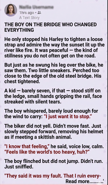 He stopped running that day. Jack ended up becoming a fierce advocate for the kid, working with social services to get him into a safe environment with an aunt who actually cared. He became the boy’s mentor, showing up to every baseball game, every graduation, every bad day, with that loud, rumbling Harley. The boy on the bridge grew up to be a counselor who saved hundreds of others, all because one stranger stopped to tighten a strap, saw the pain, and decided not to look away.