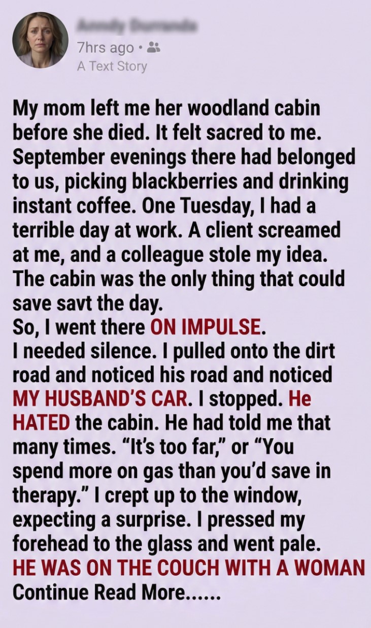 There he was—my husband—sitting on the couch in the little cabin that meant everything to me. The same couch where my mom and I used to sit wrapped in blankets, drinking coffee and watching the sunset through the trees.