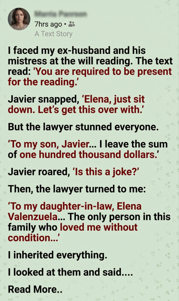 The heavy oak door of the notary’s office felt like a barrier between two worlds, separating the quiet sanity of the hallway from the suffocating toxicity waiting inside, yet I walked through it knowing that my ex-husband, his mistress, and his mother would be waiting like vultures circling a carcass. I showed up anyway, not because I wanted to see the faces that had haunted my nightmares for the past year, nor because I missed the life I had violently lost, but because the message on my phone had made my stomach drop with a command I couldn’t ignore: “You are required to be present for the reading.” When I finally stepped into the room, the air was thick with the scent of expensive leather and old paper, a smell that usually comforted me but today made me nauseous. I didn’t sit down in the empty chair they had left for me; instead, I stayed standing near the bookshelf with my arms crossed tight against my chest, as if keeping my body rigid enough would prevent my heart from betraying the anxiety thundering against my ribs. The lawyer, Gavin Herrera, looked up from his desk, adjusted his wire-rimmed glasses, and spoke with a professional calm that contrasted sharply with the tension in the room, looking directly at me to say, “Mrs. Valenzuela… I’m glad you decided to join us.”
