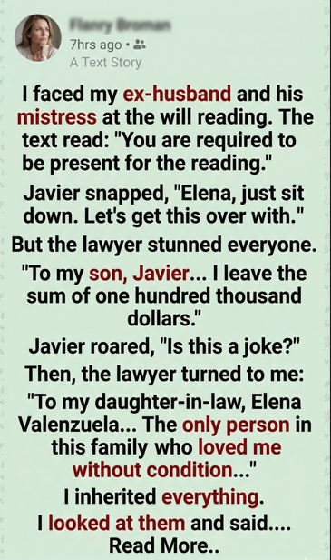 The heavy oak door of the notary’s office felt like a barrier between two worlds, separating the quiet sanity of the hallway from the suffocating toxicity waiting inside, yet I walked through it knowing that my ex-husband, his mistress, and his mother would be waiting like vultures circling a carcass. I showed up anyway, not because I wanted to see the faces that had haunted my nightmares for the past year, nor because I missed the life I had violently lost, but because the message on my phone had made my stomach drop with a command I couldn’t ignore: “You are required to be present for the reading.” When I finally stepped into the room, the air was thick with the scent of expensive leather and old paper, a smell that usually comforted me but today made me nauseous. I didn’t sit down in the empty chair they had left for me; instead, I stayed standing near the bookshelf with my arms crossed tight against my chest, as if keeping my body rigid enough would prevent my heart from betraying the anxiety thundering against my ribs. The lawyer, Gavin Herrera, looked up from his desk, adjusted his wire-rimmed glasses, and spoke with a professional calm that contrasted sharply with the tension in the room, looking directly at me to say, “Mrs. Valenzuela… I’m glad you decided to join us.”